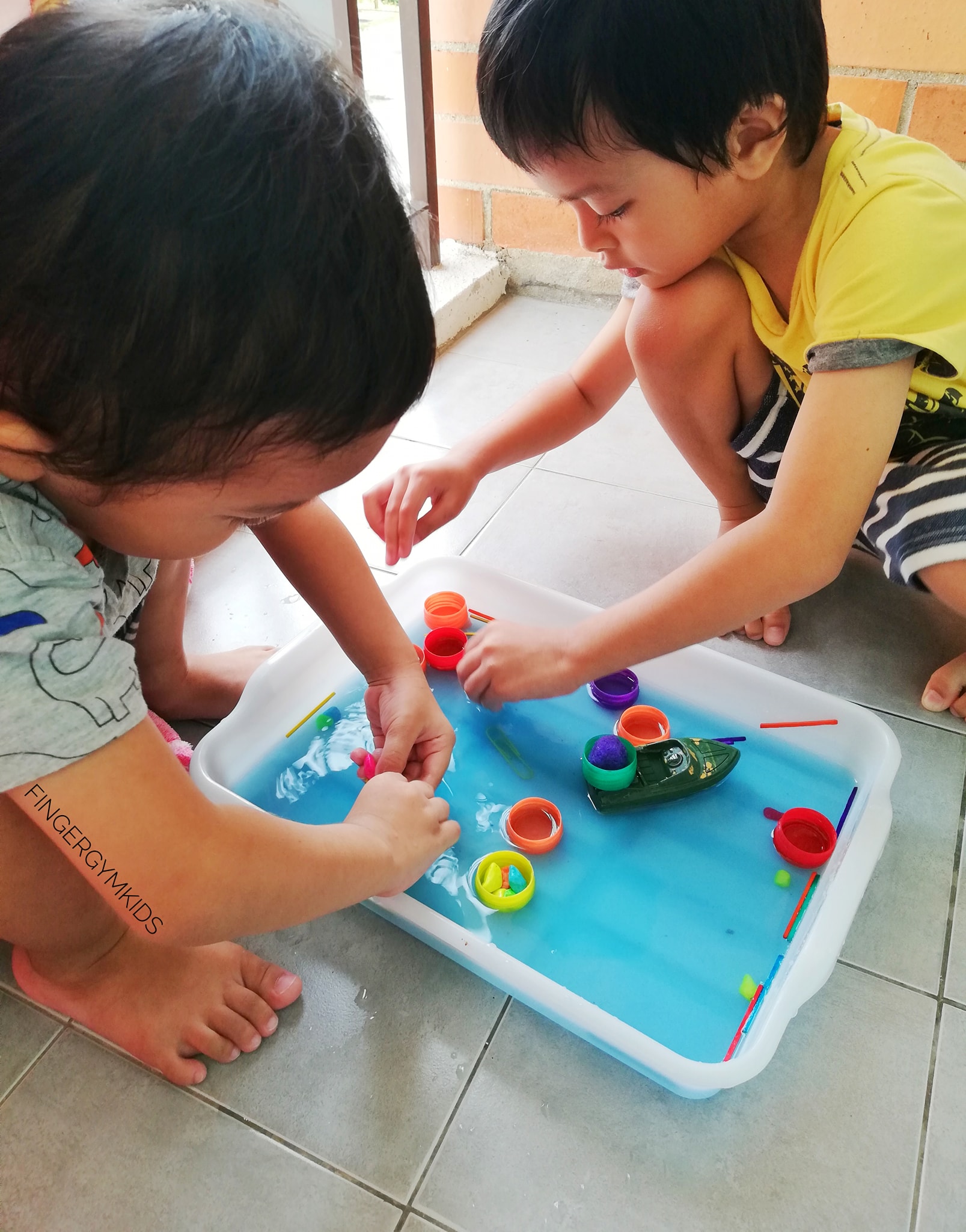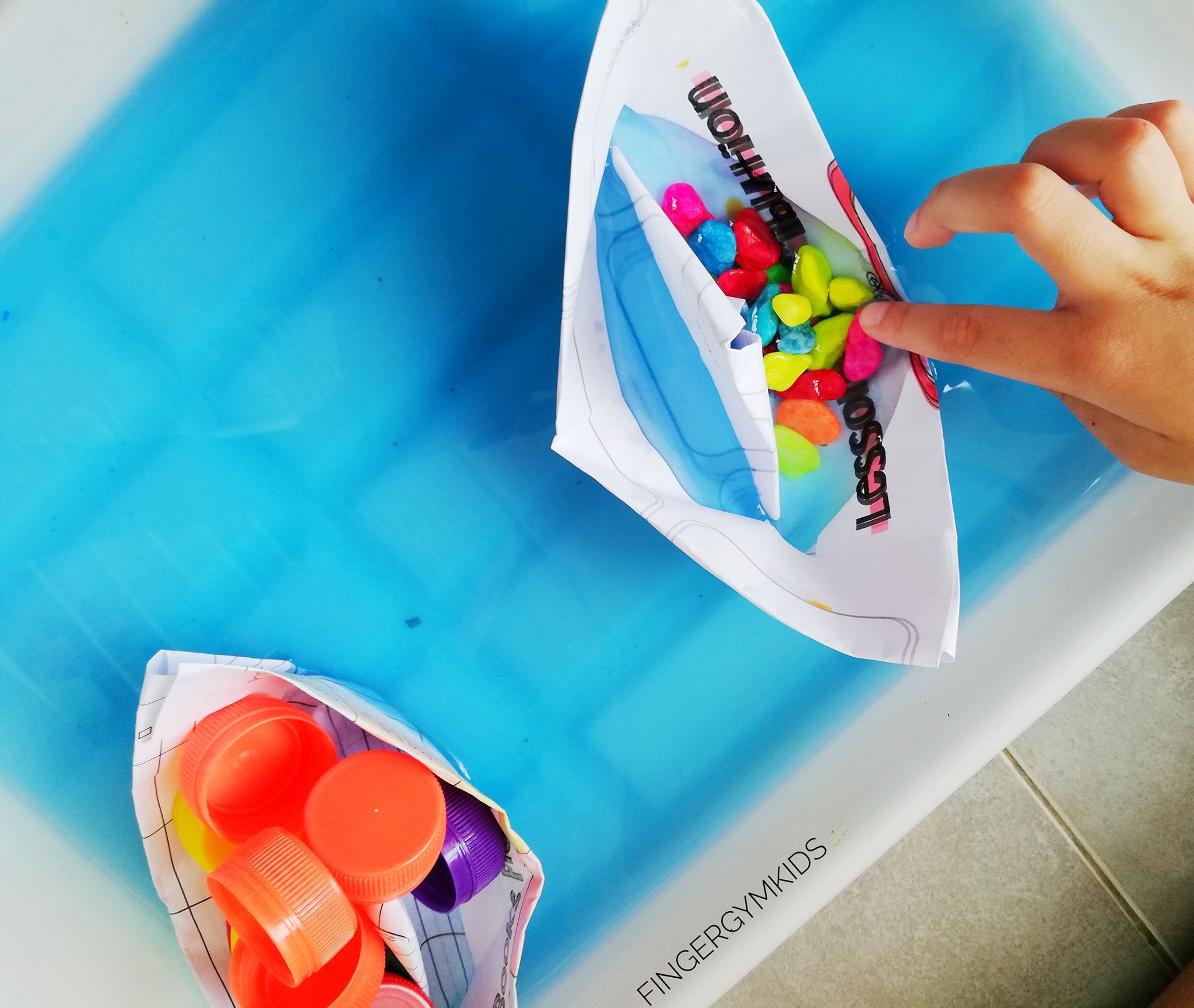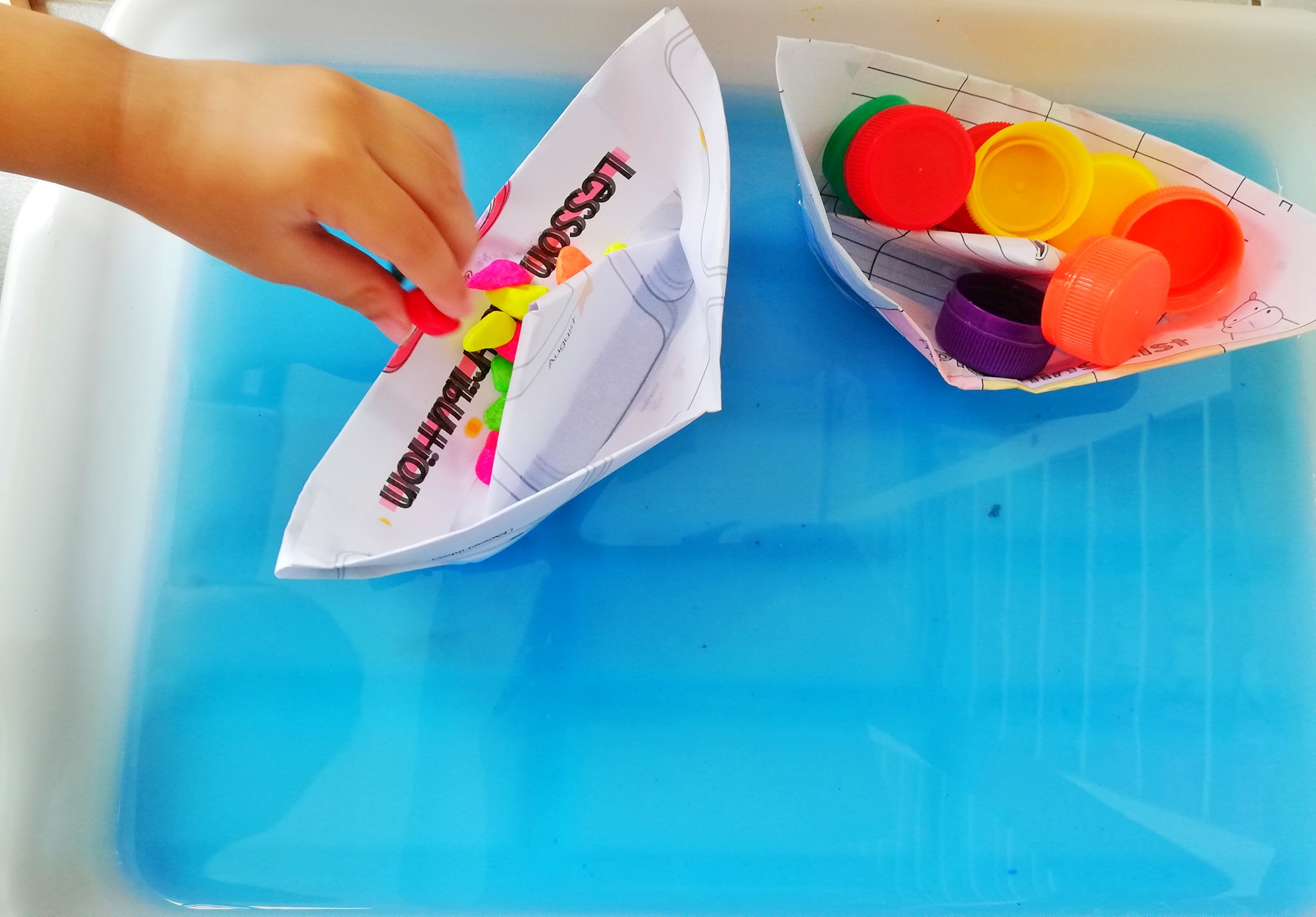 Mula-mula, kami tuang air dalam tray besar, lepas tu saya titiskan pewarna biru sikit dalam air tu supaya nampak macam laut. Anak-anak teruja tengok air berubah warna. Saya pun cakap, “Alright, ni laut kita. Nanti kita akan tengok bot kertas kita ni boleh tak float atas air.”