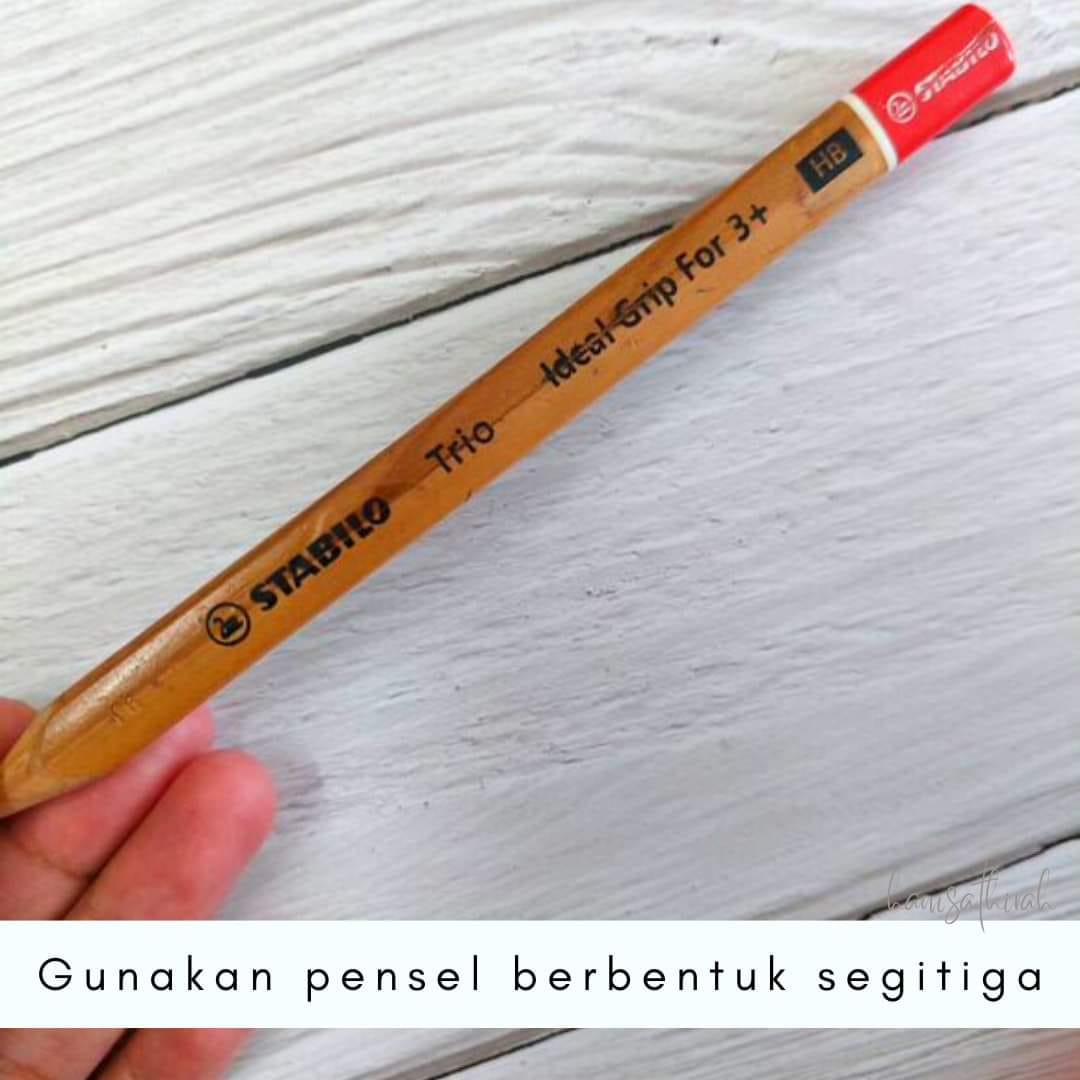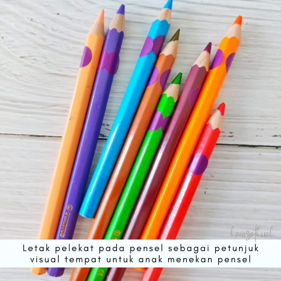 2. Letak pelekat pada pensel sebagai petunjuk visual tempat untuk anak menekan pensel